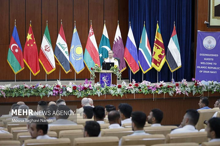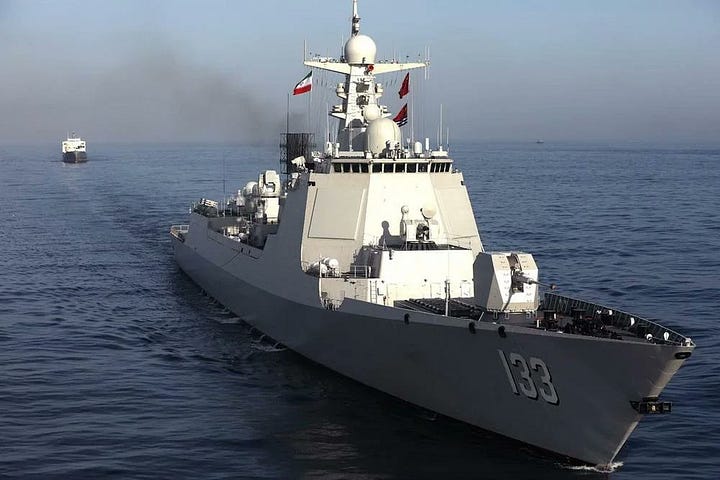 Iran hosted the "Security Belt 2025" naval exercise, which included a Chinese and Russian naval presence, at the southeastern port of Chabahar in March 2025. A forthcoming trilateral naval exercise was reported well in advance of recent events in Iran and the current crisis with the United States. Any forthcoming Chinese presence off the Iranian coast will almost certainly entail the presence of ships from the PLA Navy's 48th escort group, two of the three ships of which recently participated in a multinational naval exercise hosted by South Africa. Any forthcoming Russian presence off the Iranian coast will entail the deployment of a corvette and accompanying logistical support ship from the Baltic Fleet that recently participated in the same multinational naval exercise hosted by South Africa and/or will require the frigate Marshal Shaposhnikov, which recently made an appearance at a naval exhibition in Qatar, to make a port of call in Iran instead of returning home to the Pacific Fleet. The attached images are from the 2025 naval exercise.