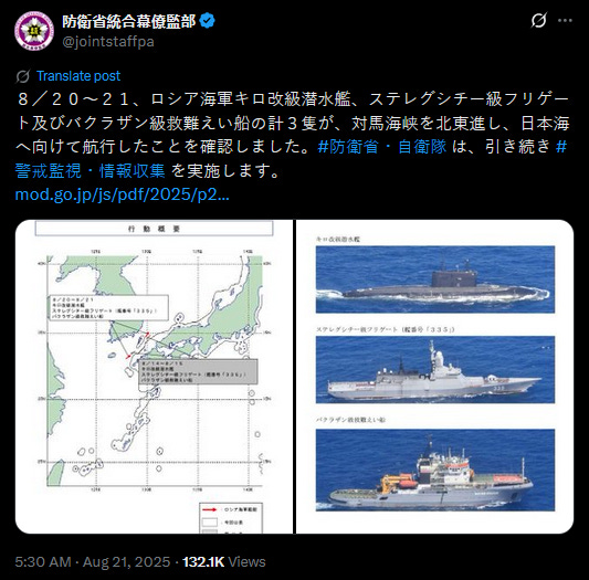 It also explains the unusual surface transit of a Russian diesel-electric submarine and two accompanying surface ships through the Tsushima Strait.