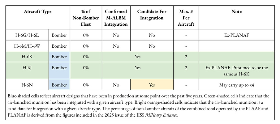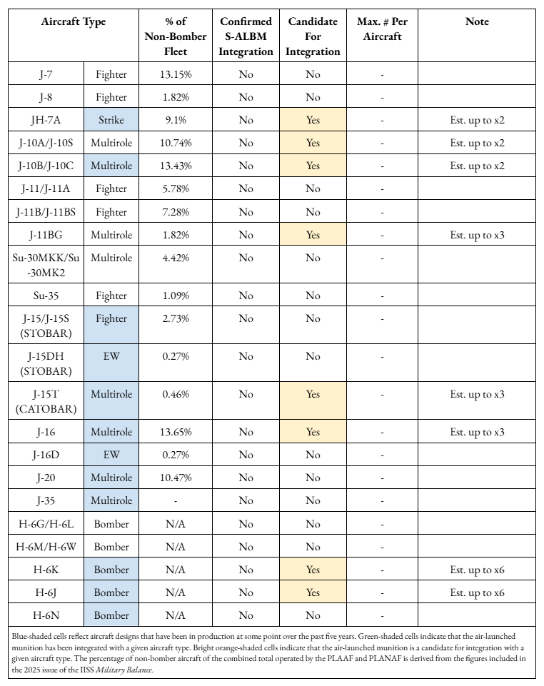 The developmental and operational status of the S-ALBM is uncertain, and it may not be intended for deployment with the PLAAF or PLANAF. Supposing that the S-ALBM weighs around 1500 kg, a wide range of PLA combat aircraft may carry this smaller air-launched ballistic missile design.