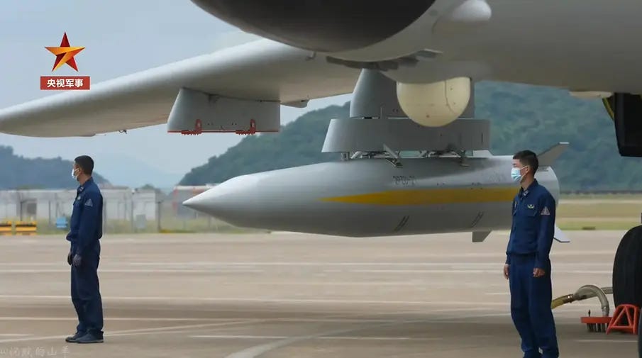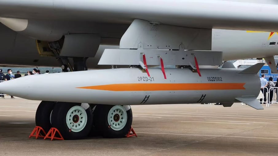 The air-launched ballistic missiles seen loaded onto the wing stations (x2) of an operational PLAAF H-6K bomber at the 2022 Zhuhai Airshow were labelled 2PZD-21, which appears to indicate that these were inert captive carry missiles designed for use in training flights—these simulate the load and aerodynamic effects of carrying a functional air-launched ballistic missile of this type. With the suffix of the inert captive carry missile being -21, Chinese social media users refer to this air-launched ballistic missile design as the KD-21. The American designation for this distinct and much smaller Chinese air-launched ballistic missile design, which was unexpectedly unveiled around two and a half years ago, is not public knowledge as of March 2025. China’s senior military leaders appear to have approved the unexpected formal unveiling of this medium-size air-launched ballistic missile, which will be referred to as M-ALBM for the purposes of this report, at the 2022 Zhuhai Airshow, where it was notably displayed alongside two other previously unknown PLAAF strike munitions. The previously unknown KF-98 air-launched cruise missile and the KF-088C loitering anti-radiation missile were also part of what is best characterized as a primarily “show, don’t tell” PLAAF display.