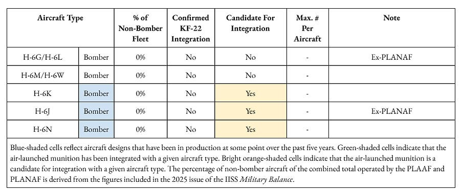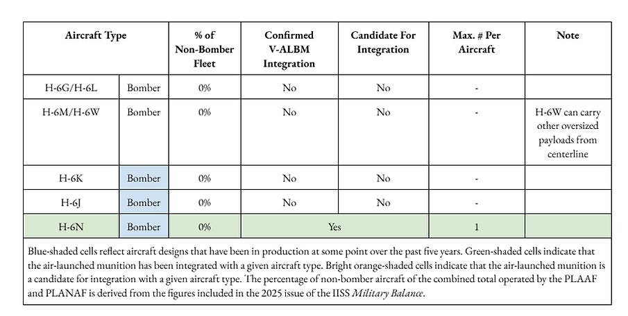 In 2018, observers operating with publicly available information first learned of the American CH-AS-X-13 designation for a previously unknown Chinese air-launched ballistic missile. In 2018, observers learned from official U.S. government disclosures that China was developing two air-launched ballistic missiles, one of which may be nuclear-armed. Leaving aside the apparent KF-22 air-launched ballistic missile, which was informally unveiled in March 2025, observers operating with publicly available information confront the fact that the H-6N bomber has been seen carrying two distinct but likely related very large air-launched ballistic missiles, the MARV-equipped VL-ALBM Mod 1 and the MGV-equipped VL-ALBM Mod 2. In September 2022, the PLAAF formally unveiled a separate and previously unknown air-launched ballistic missile at the 2022 Zhuhai Airshow. This air-launched ballistic missile is not carried on the semi-recessed centerline station of a specially configured, reportedly nuclear-capable H-6N. It is, rather, mounted on the wing stations of the earlier turbofan-powered H-6K bomber and may also be compatible with both the H-6J and the H-6N. Observers operating with publicly available information cannot discern whether this much smaller air-launched ballistic missile is one of the two such missiles referred to in official U.S. government disclosures in the 2018-2019 timeframe or an entirely separate air-launched ballistic missile design.