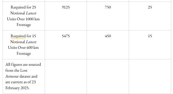 Perhaps a notional 1000 kilometers of actively contested frontage does not accurately reflect the everyday realities of the Russia-Ukraine War. The approximately 400-kilometer-long riverine sector is a low priority for both Russia and Ukraine, and the vast majority of combat activity takes place along the 600 or so kilometers of actively contested frontage east of the Dnieper to the international border. An analytically convenient assumption is that the Vovchansk and Sudzha sectors instantaneously become inactive, largely restricting daily ground combat over a frontage of around 600 kilometers. To cover this 600 kilometers of actively contested frontage, Russia will need to deploy fewer Lancet units with a maximum practical range of 40 kilometers—just 15 notional Lancet units. To sustain an average of just one Lancet launch—attempted Lancet strike—per day over this shorter actively contested frontage, Russia will require 15 Lancets per day, 450 Lancets per 30-day month, and 5475 Lancets per year. The Lost Armour dataset, of course, only records an average of 158 documented Lancet strikes—not launches—per month over 2024, which is to say an average of just over 5 Lancet strikes per day. If the Lost Armour dataset captures most Lancet launches, then Russia will be unable to sustain a launch tempo averaging just one Lancet per day per launch unit over a reduced frontage of 600 kilometers. Given the total of 1888 documented Lancet strikes over 2024 recorded in the Lost Armour dataset, each of these 15 notional Lancet units can only sustain an average of 0.344 Lancet launches—attempted Lancet strikes—per day over a 12-month period.