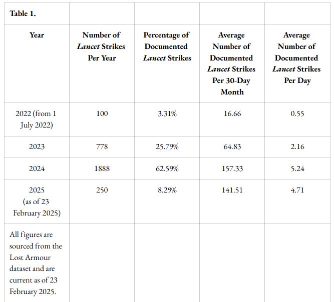 As noted earlier, the ZALA Aero Group’s Telegram account made a post referring to the Lost Armour dataset’s tabulation of 3000 documented Lancet strikes. This is a large and seemingly impressive figure in absolute terms. But what does it indicate about Lancet usage in the Russia-Ukraine War? The Lost Armour dataset records documented Lancet strikes from July 2022 to the present. The dataset is likely to be a lagging indicator of Lancet strikes with regular delays of several days, if not several weeks. As a result, the figures for early 2025 are likely to be an undercount.