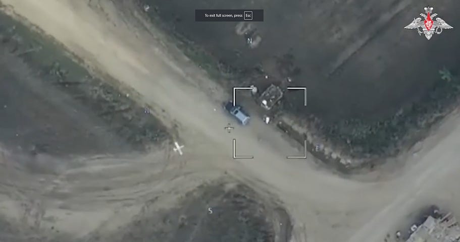 Footage of Lancet strikes captured by an ISR drone, which captures the distinct cruciform winged airframe of the Lancet as it undertakes a dive toward its designated target