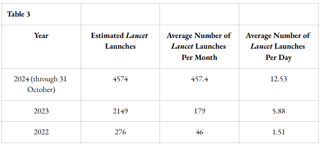The Lost Armour dataset records 1656 documented Lancet strikes—not launches—from 1 January 2024 through 31 October 2024, 778 Lancet strikes over the course of 2023, and 100 Lancet strikes over the course of 2022. This amounts to a total of 2534 documented Lancet strikes through the end of October 2024, of which 65.35% took place over the course of the first 10 months of 2024, 30.7% took place in 2023, and 3.94% took place in 2022. If this distribution of documented Lancet strikes is projected onto to the Kyiv Independent’s total of 7000 Lancet launches by early November 2024, it is possible to develop a low-confidence estimate of 4574 Lancet launches in 2024, 2149 Lancet launches in 2023, and 276 Lancet launches in 2022. Table 3 lays out what this will mean in terms of the average number of Lancet launches per month and per day.