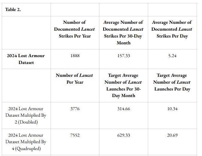 It is, of course, possible, even likely, that the Lost Armour dataset, which only records documented Lancet strikes—not launches—does not accurately reflect the actual scale of Lancet usage. Perhaps the official and unofficial Russian disclosures of Lancet use are very much less than complete, even in cases in which the loitering strike drone impacts its intended target (irrespective of terminal effects on the intended target). What if the Lost Armour dataset’s recorded totals for documented Lancet strikes—not launches—reflect just 50% of actual Lancet launches in a given timeframe? Will this change the situation? The Lost Armour dataset records a total of 1888 documented Lancet strikes—not launches—in 2024. Doubling this figure will provide an estimated total of 3776 Lancet launches—not strikes—in 2024. This will amount to estimates of an average of just under 315 Lancet launches per month and an average of just 10.34 Lancet launches per day over the course of 2024. With these numbers, Russia would of course be limited to just 10 notional Lancet units capable of undertaking a minimum of just one Lancet launch per day. Perhaps the Lost Armour dataset reflects even fewer—maybe just 25%—of actual Lancet launches in a given timeframe. Quadrupling the Lost Armour dataset’s recorded number of documented Lancet strikes in 2024 will provide an estimated total of 7552 Lancet launches—not strikes—in 2024. This will amount to estimates of an average of just over 629 Lancet launches per month and an average of 20.69 Lancet launches per day over the course of 2024.