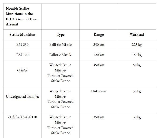 As of this writing in early 2025, the IRGC Aerospace Force only retains a monopoly over a specific albeit very important subset of Iran’s diverse arsenal of strike munitions: ballistic missiles with a maximum range exceeding 500 or so kilometers. When it comes to shorter-range ballistic missiles, land-attack cruise missiles of all types, and strike drones of all types, the IRGC Aerospace Force remains the dominant player by a large margin but has nevertheless lost its monopoly over Iran's strike capabilities. Iran’s regular military, the Artesh, is deploying long-range strike munitions in its ground, air, and naval forces. This includes some strike munitions—designs that are often not deployed by any part of the IRGC—that overlap with the strike munitions employed by the IRGC Aerospace Force in terms of range. Other parts of the IRGC are also deploying long-range strike munitions of their own. This includes the IRGC Ground Force, which not only operates helicopters as well as both armed and unarmed reusable runway-dependent uncrewed ISR aircraft but also ballistic missiles with a maximum range of at least 250 km, cruise missiles with a maximum range of at least 450 km, and propeller-driven strike drones with a maximum range that likely approaches 1000 km.