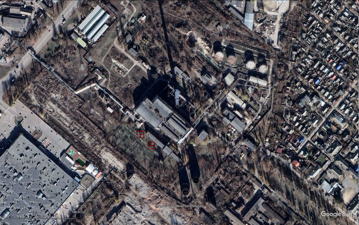 The above video begins with the relatively high definition sensor feed of a(nother) Russian drone rather than the single-use armed “FPV” multirotor drone that undertakes the attack. The video captured by the armed “FPV” multirotor drone itself offers a good view of Ukrainian efforts toward hardening these key nodes of electricity transmission infrastructure.