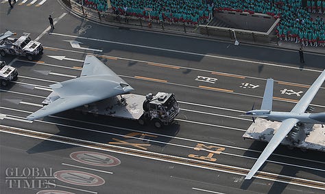 One example of such a Chinese uncrewed aircraft is the GJ-11, which was formally unveiled at a 2019 military parade in Beijing (the carrier-based naval variant, the GJ-21, was one of several large uncrewed aircraft designs displayed at the September 2025 military parade in Beijing).