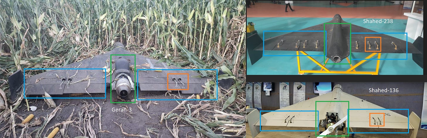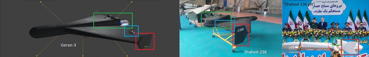 Better images through which to compare the new Russian turbojet-powered Geran-3 with the Iranian turbojet-powered Shahed-238 and "Shahed-136 jet," as well as the original propeller-driven Shahed-136 (and the Russian-built Geran-2 and Garpiya).