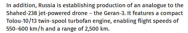 It is worth noting that in early 2025, Ukrainian media attributed to Ukrainian military intelligence the claim that Russia was working on a (Russian) turbojet-powered Shahed-136/Geran-2/Garpiya derivative that would be equipped with a much more powerful turbojet engine and a much greater top speed—as well as what I still consider to be an implausible maximum range of 2500 kilometers—than the turbojet-powered Geran-3 that Ukrainian military intelligence disclosed today. There may be more than one Russian turbojet-powered Shahed-136/Geran-2/Garpiya derivative in existence—the other may be a faster but shorter-range design.