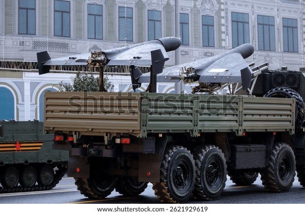An image from the May 2025 Moscow parade for reference (an Alabuga-built Geran-2 on the left and an Izhevsk-built Garpiya on the right)