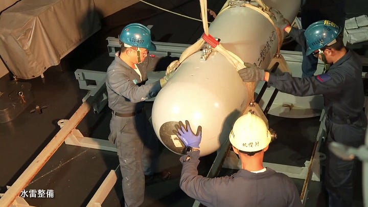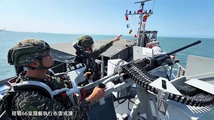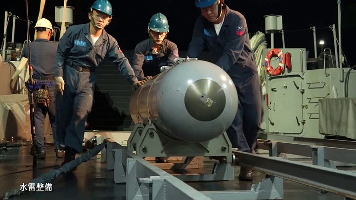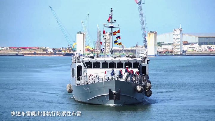 The above video starts by highlighting Taiwan’s (naval) minelaying capabilities, including one of the Min Jiang-class minelayers currently in service with the Taiwanese navy—additional hulls are on order. While (naval) minelaying is likely to constitute a consequential Taiwanese capability set in a Taiwan invasion scenario, this approach to (naval) minelaying is increasingly impractical for Taiwan. The People’s Liberation Army’s (PLA) maritime strike capabilities are increasingly formidable, and the scope for using the likes of not just anti-ship cruise missiles but also propeller-driven strike drones to target dedicated and ad hoc (naval) minelayers in and around the Taiwan Strait is fast increasing. Taiwan’s purpose-built Min Jiang-class minelayers may be quite fast and inexpensive, but are also small and have negligible air defence capabilities—note the second image.